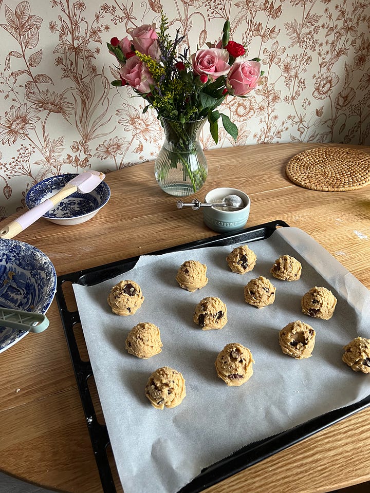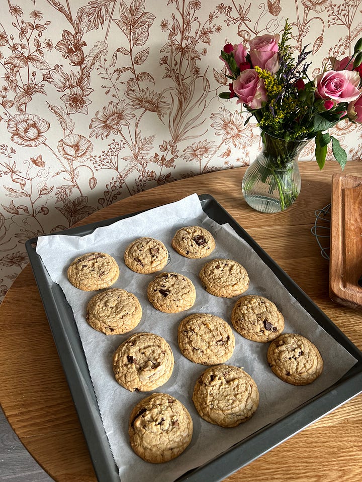 Place the frozen cookie scoops on the tray, making sure to leave plenty of space between each cookie to avoid them from sticking together. Bake for 10-13 minutes. The cookie should still be soft in the middle, sprinkle with sea salt and enjoy!